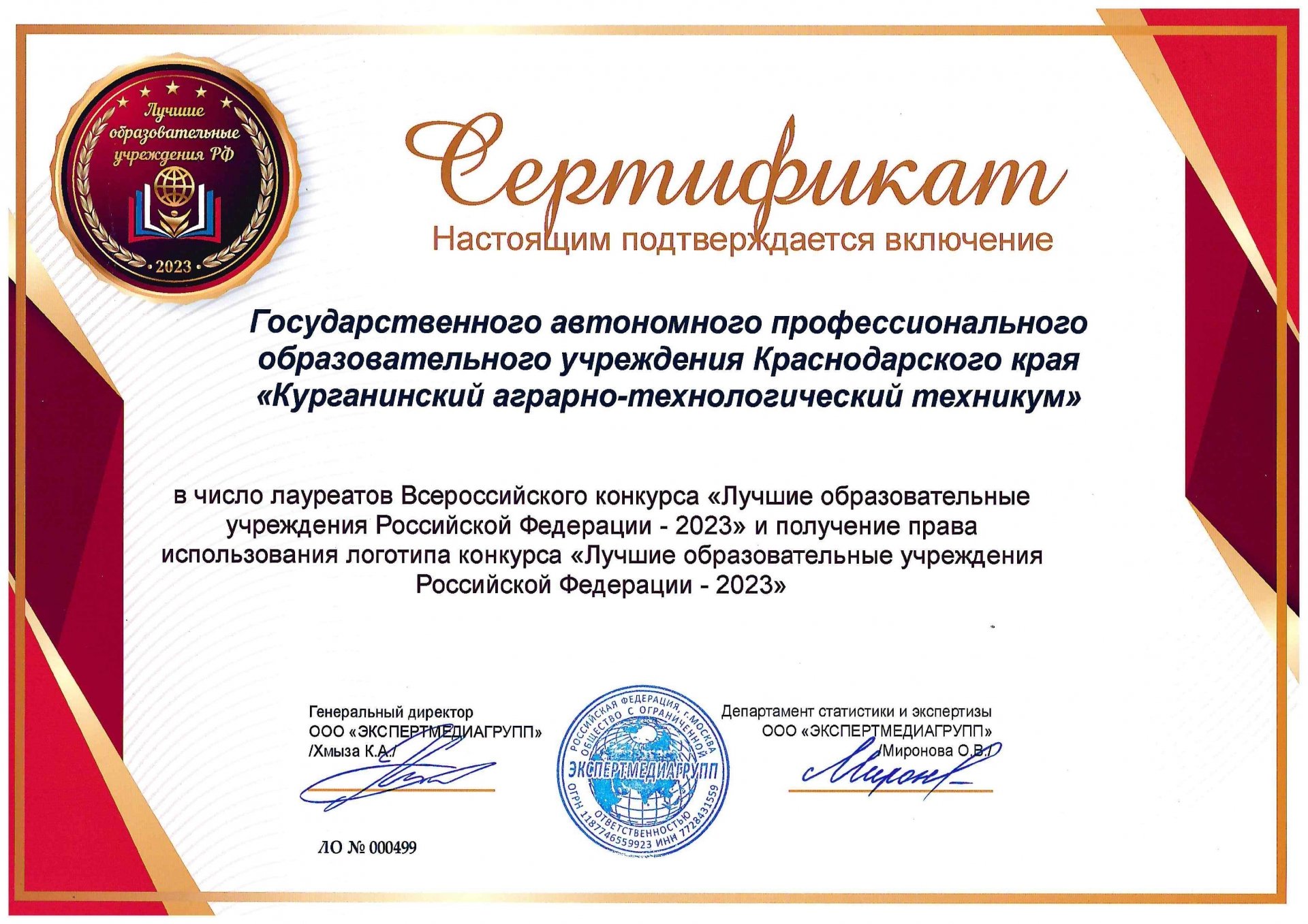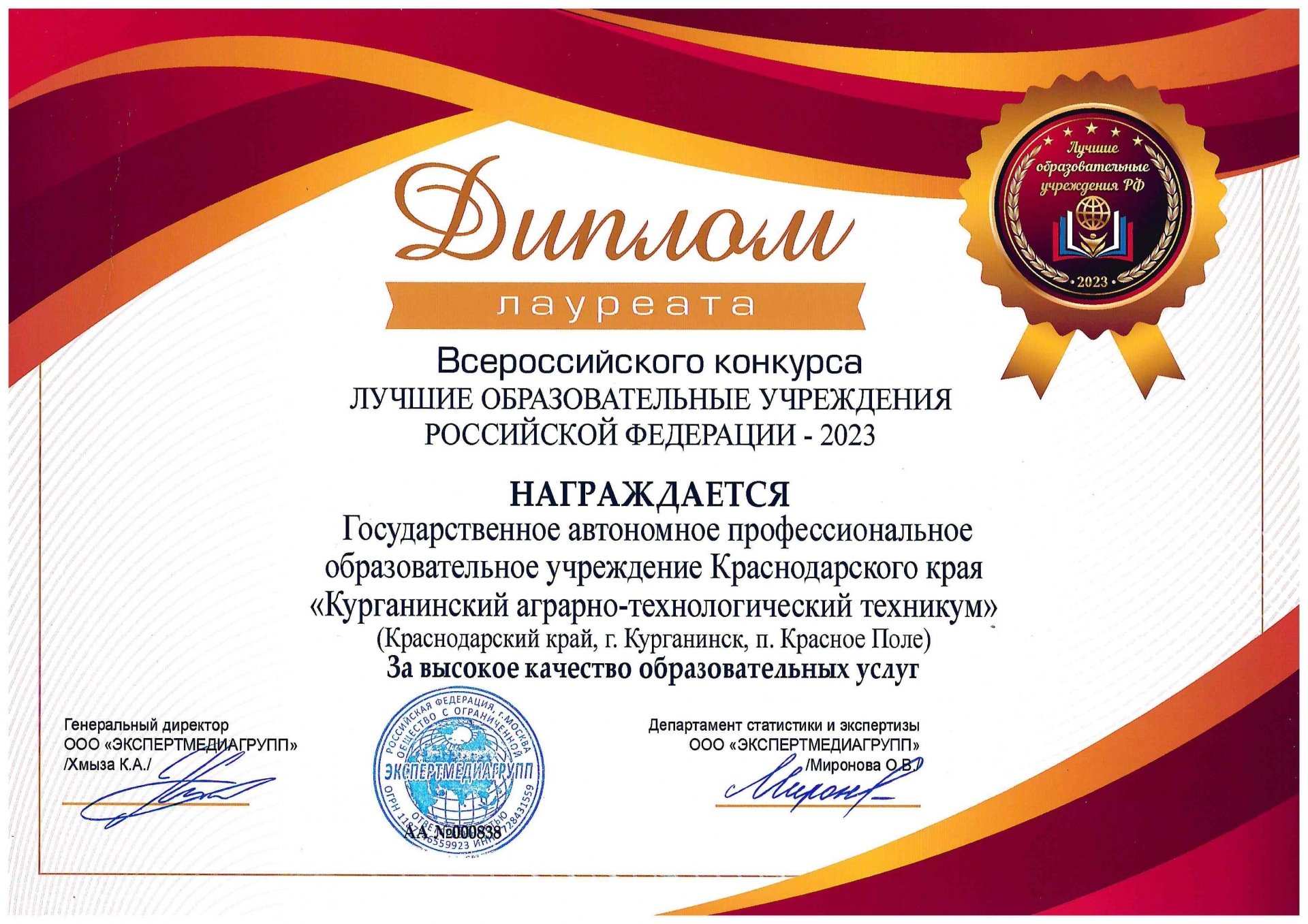 от 30.10.2013 № 6499 государственное бюджетное образовательное учреждении среднего профессионального образования «Курганинский аграрно-технологический техникум» Краснодарского края переименовано в государственное бюджетное профессиональное образовательное учреждение Краснодарского края «Курганинский аграрно-технологический техникум».