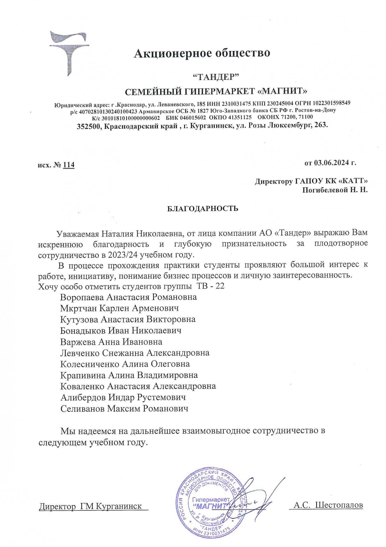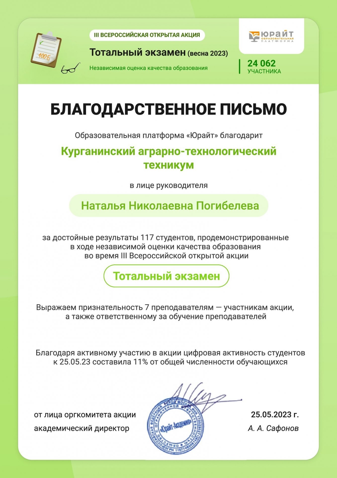 С 25 апреля 2022 года «Курганинский аграрно-технологический техникум» возглавил молодой, энергичный, перспективный руководитель - Наталия Николаевна Погибелева. Ее главная цель – сделать техникум «профильным», открыть новые профессии и специальности, наиболее востребованные в Курганинском районе и Краснодарском крае.