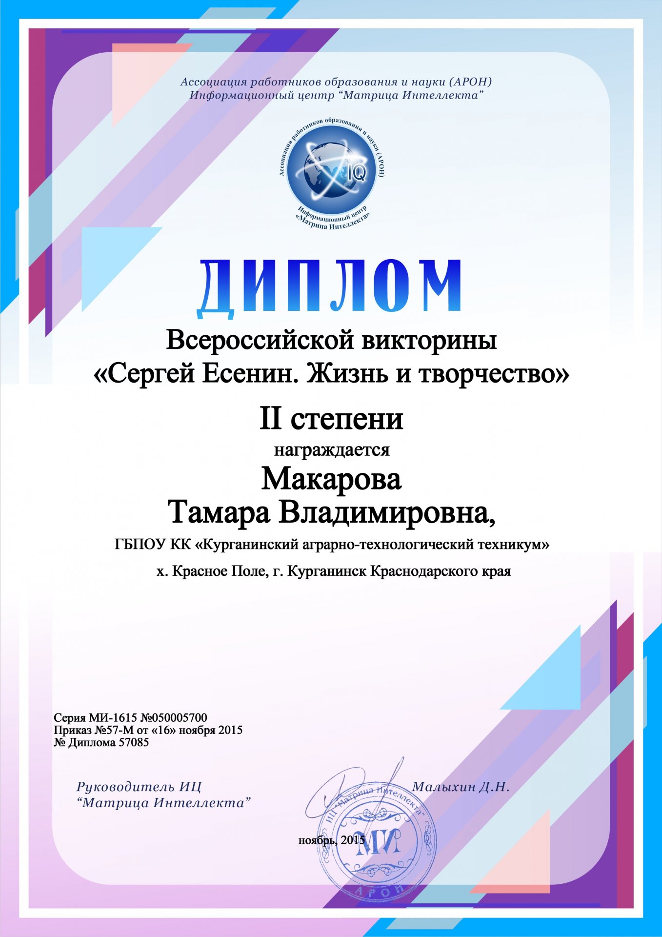 Преподаватель русского языка и литературы Макарова Тамара Владимировна приняла участие во Всероссийской викторине «Сергей Есенин. Жизнь и творчество» проводимой Ассоциацией работников образования и науки (АРОН) информационным центром «Матрица интеллекта» - результат диплом 2 степени.